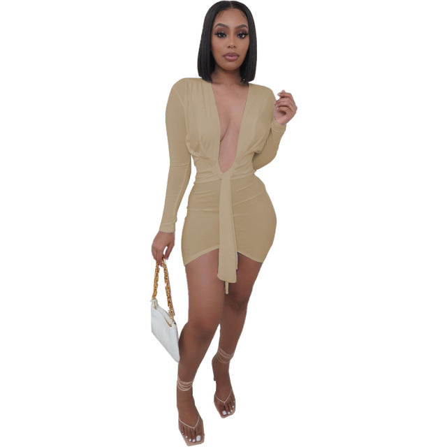 ANJAMANOR Sexy Deep V Neck Long Sleeve Dresses for Women 2021 Black White Bodycon Mini Dress Night Club Outfits D21-CE22