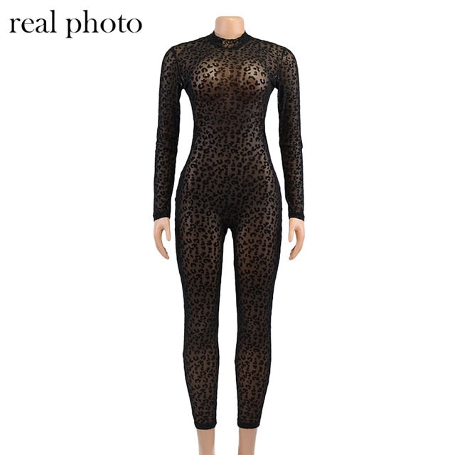 Simenual Animal Instinct Mesh Bodystocking Leopard See Through Velour Long Sleeve Rompers Womens Jumpsuit Sexy Midnight Clubwear